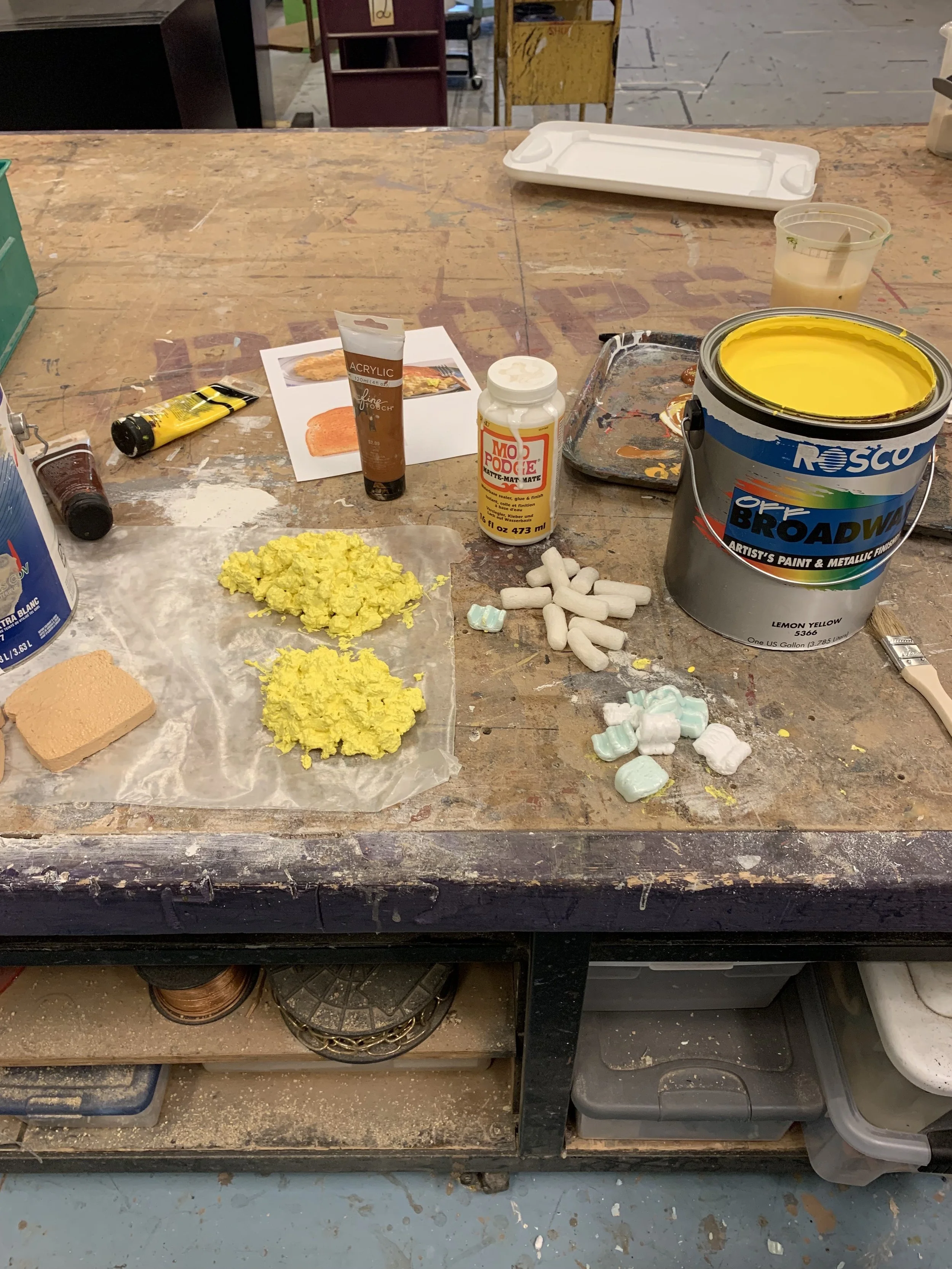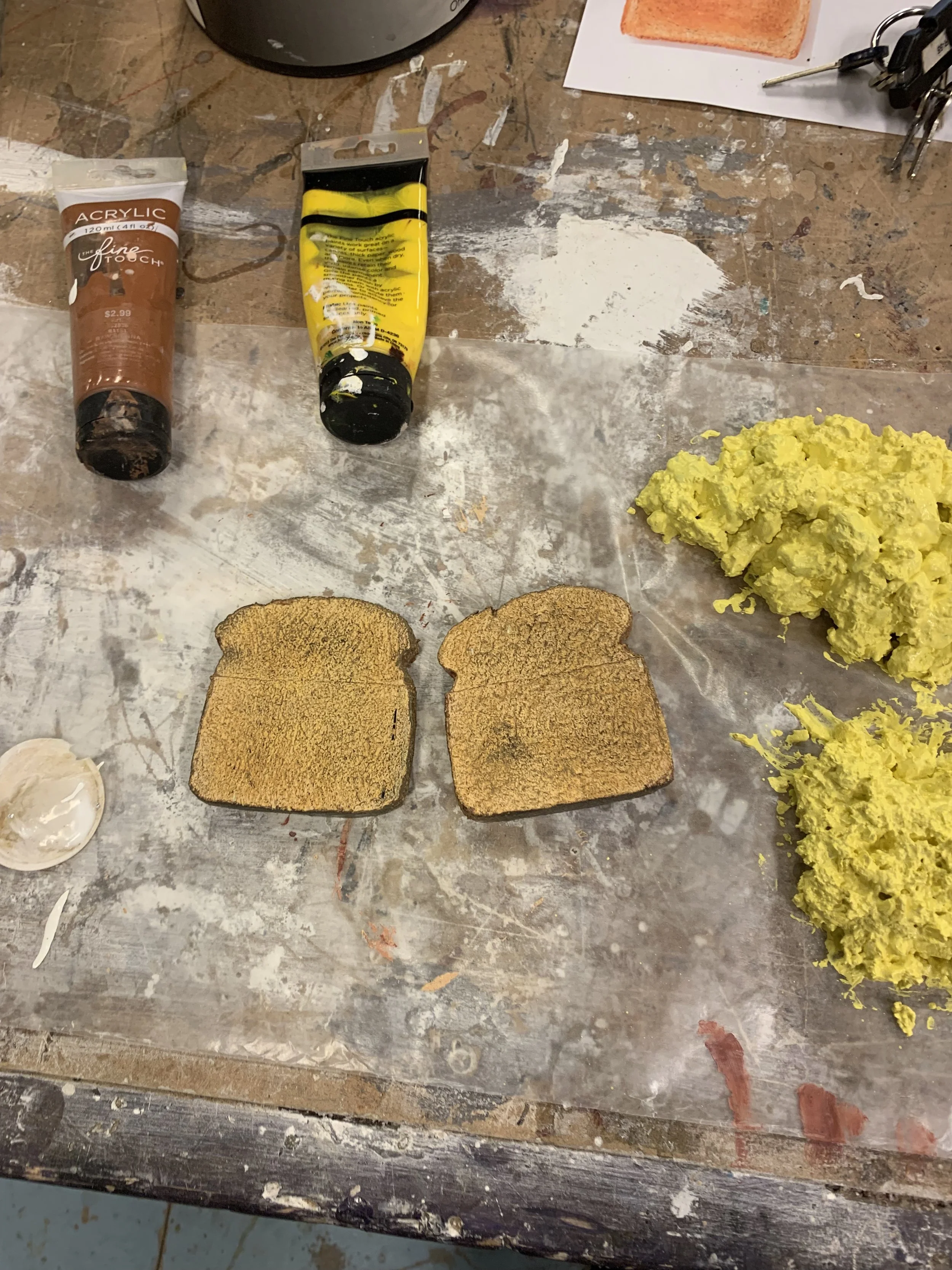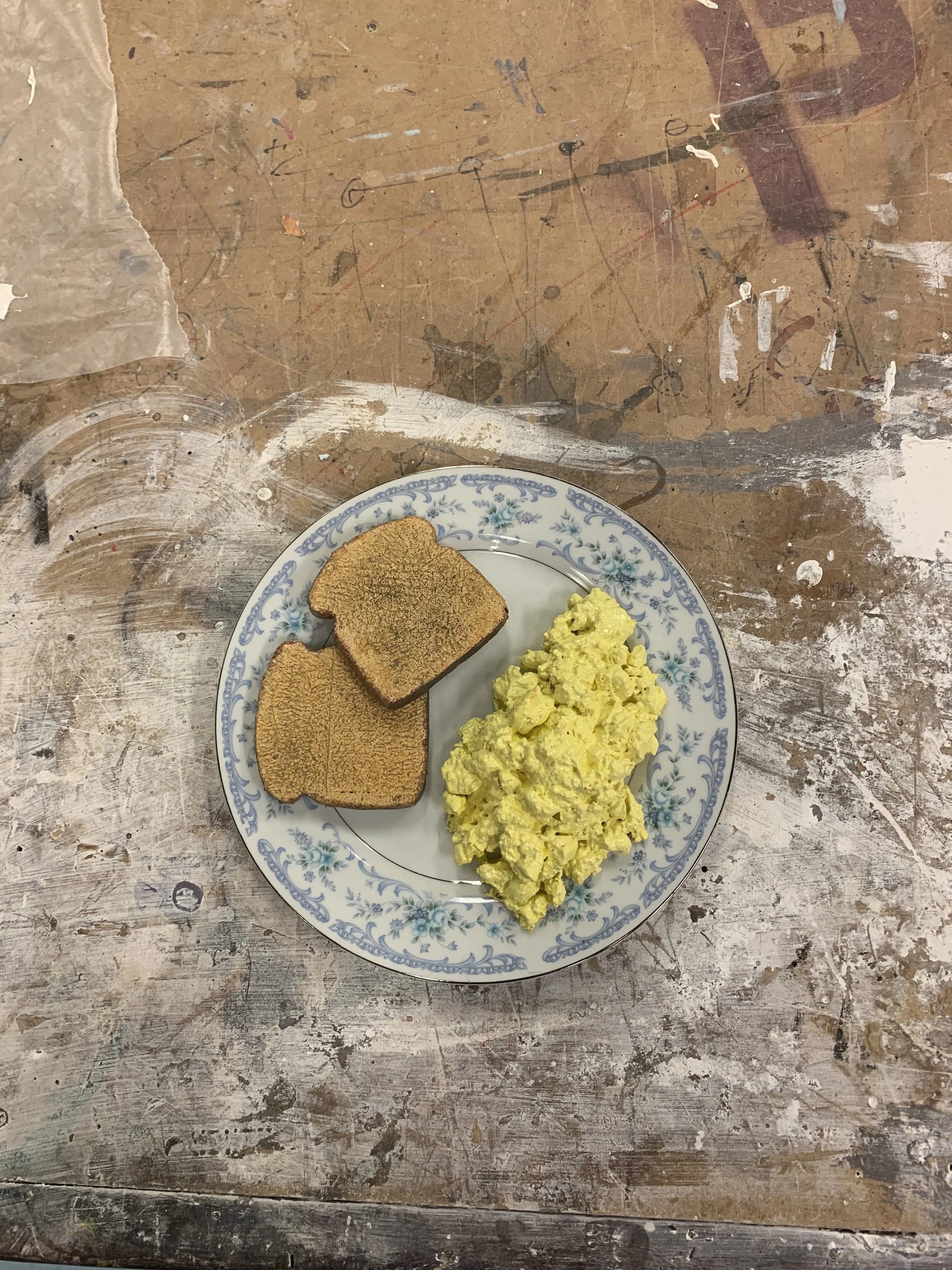 A plate of scrambled eggs and two slices of toast made for a production of She Loves Me at the University of Maryland. The toast is made of pink foam insulation and the scrambled eggs are made of packing peanuts.
